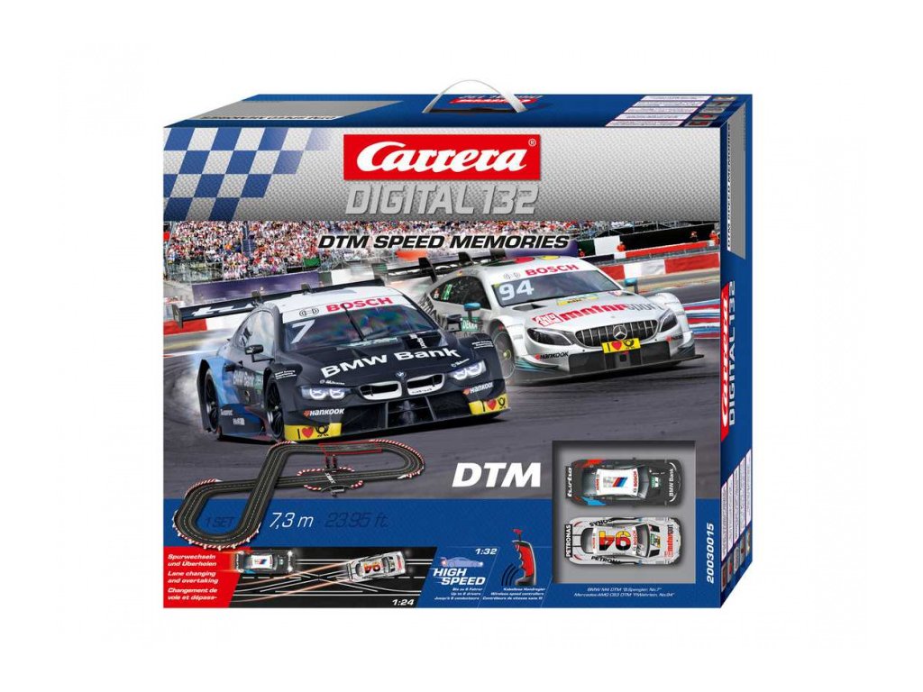 Autodráha Carrera Digital 132 dlouhá 7,3 m s auty BMW M4 DTM a Mercedes-AMG C 63 DTM obsahuje rovinky, zatáčky, přemostění, díl na předjíždění z obou stran, napájecí díl a další díly.