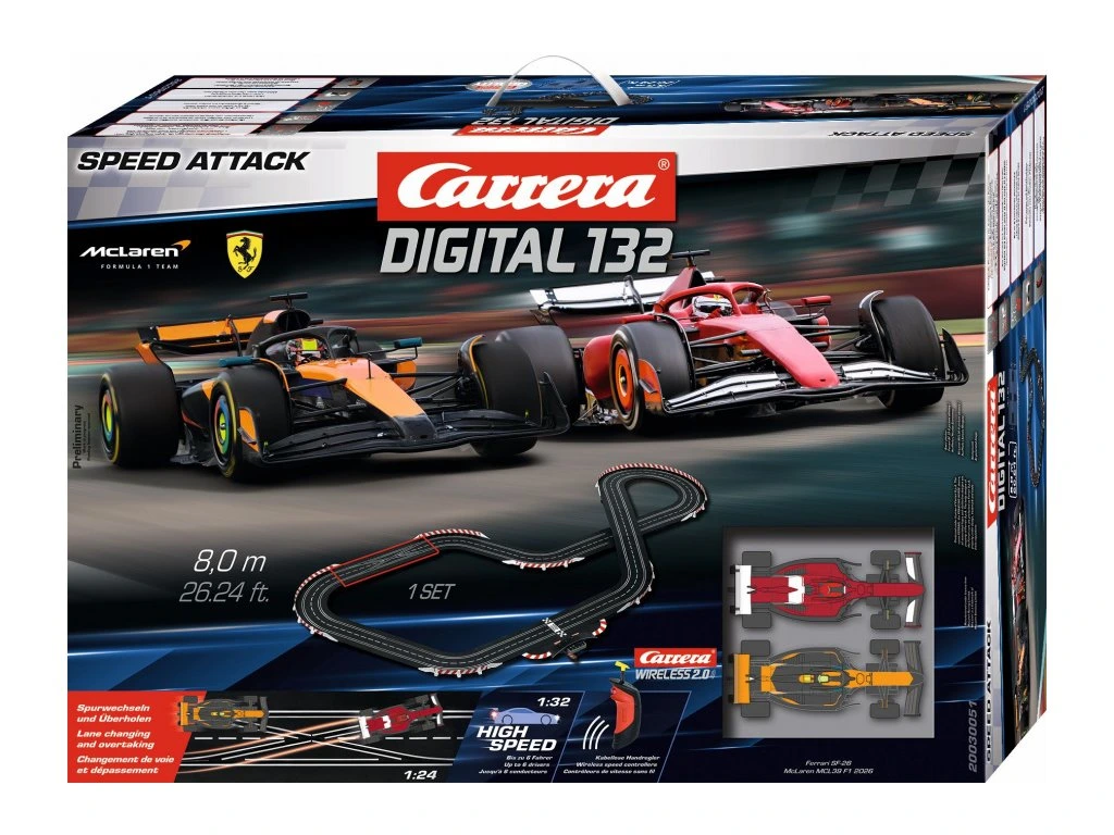 Autodráha Carrera Digital 132 dlouhá 7,3m s auty F1 Ferrari a McLaren obsahuje rovinky, zatáčky, bezdrátové ovladače, přemostění, díl na předjíždění zleva a zprava, napájecí díl a další díly.