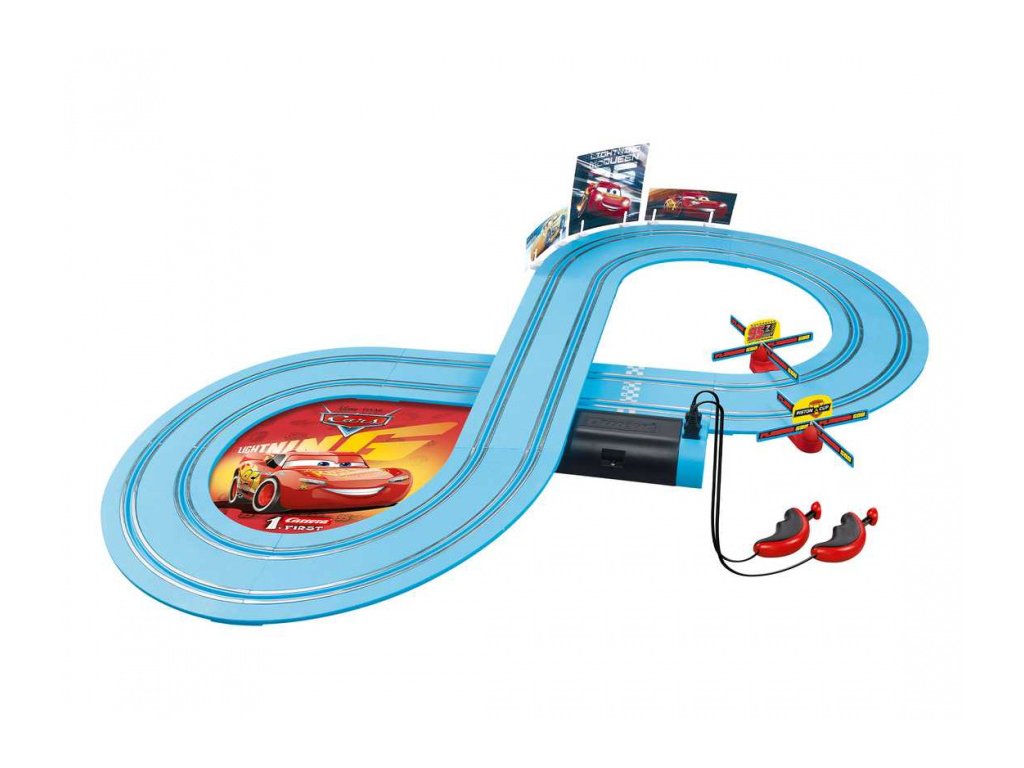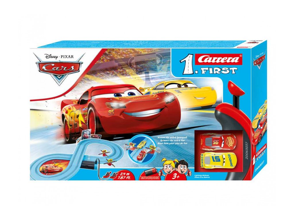 Autodráha Carrera FIRST dlouhá 2,4m s auty Blesk McQueen a Dinoco Cruz z filmu CARS, pro děti od 3 let, na baterie, obsahuje rovinky, zatáčky, točíčí bránu, ovladače a dekorace s tématikou CARS.