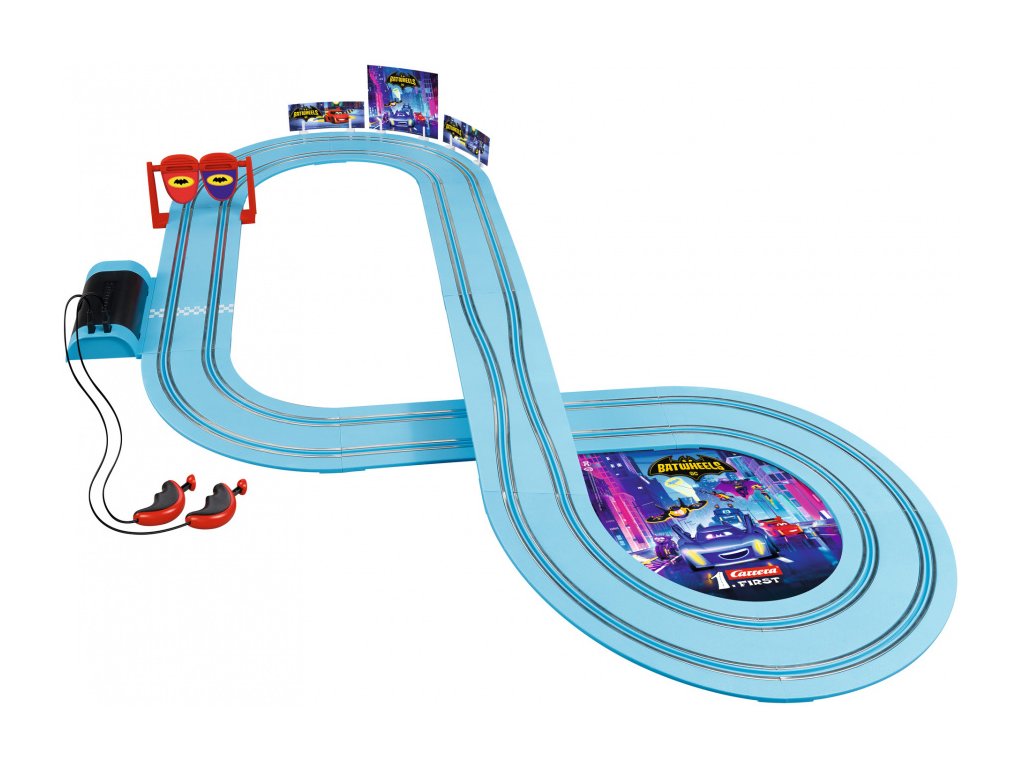 Bam a jeho společník Redbird, Robinovo auto, se připojí k akci na závodní dráze Carrera FIRST. Sada „Batwheels Ready to Roll“ ukazuje, jak se dvě malá superauta prohánějí po modrém závodním okruhu o délce 2,9 metru. Hravé doplňky, jako je hrací automat a sekce se zúžením dráhy, zajišťují ještě více zábavy a četné dekorativní prvky ze série zaručují úsměvy a autentické vzrušení Batwheels!