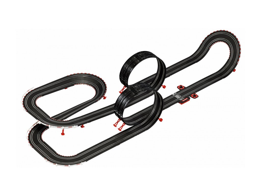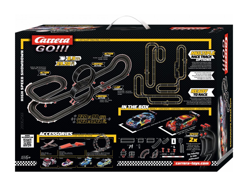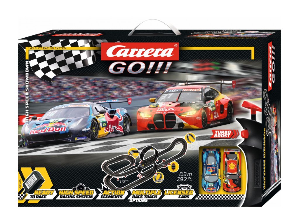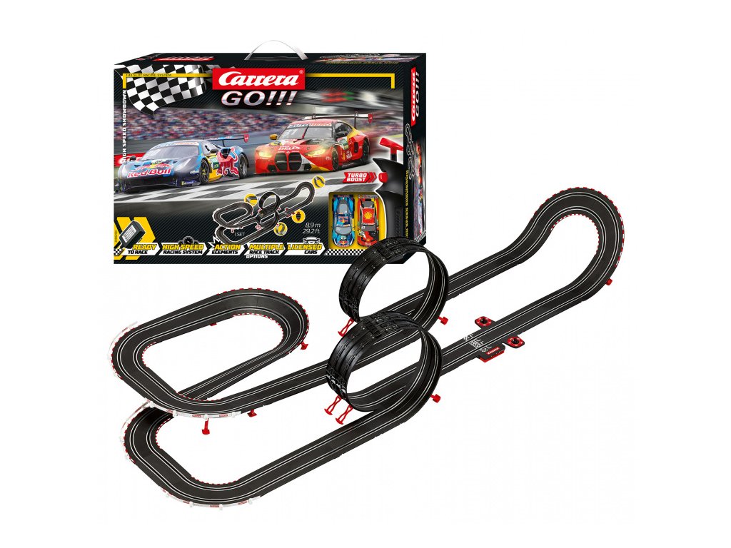 Autodráha Carrera GO!!! dlouhá 8,9m s auty BMW M4 GT3 a Ferrari 488 GT3, obsahuje dva loopingy, klopenou zatáčku, kolmou stěnu, rovinky, zatáčky, díl s počítadlem kol a další díly. Můžete si sestavit další různé trati podle své fantazie.