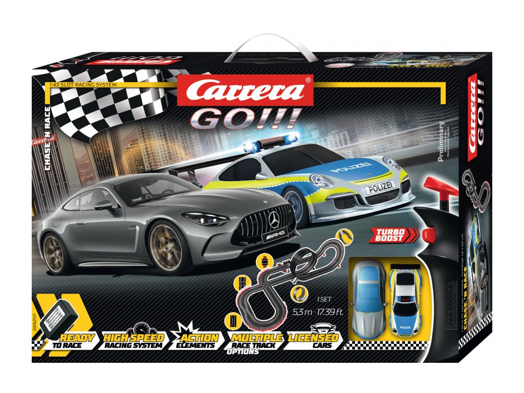 Autodráha Carrera GO!!! dlouhá 5,3m s auty Mercedes-AMG GT 63 a policejním Porsche 911 GT3, obsahuje looping, křižovatku, rovinky, zatáčky, kolmou stěnu, díl s počítadlem kol a další díly. Můžete si sestavit další různé trati podle své fantazie.