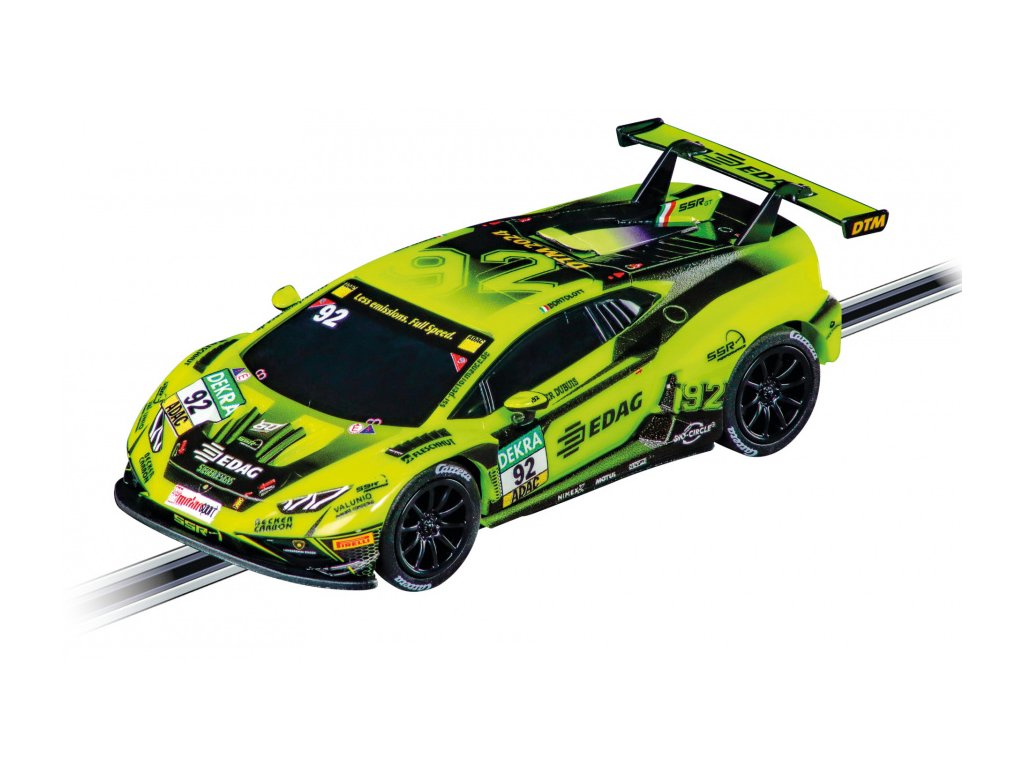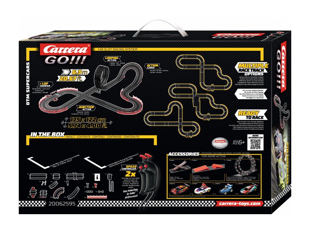 Autodráha Carrera GO!!! dlouhá 6,3m s auty série GT3 Audi R8 LMS a Lamborghini Huracán obsahuje křižovatku, rovinky, zatáčky, klopenou zatáčku, looping, díl s počítadlem kol a další díly. Můžete si sestavit další různé trati podle své fantazie.